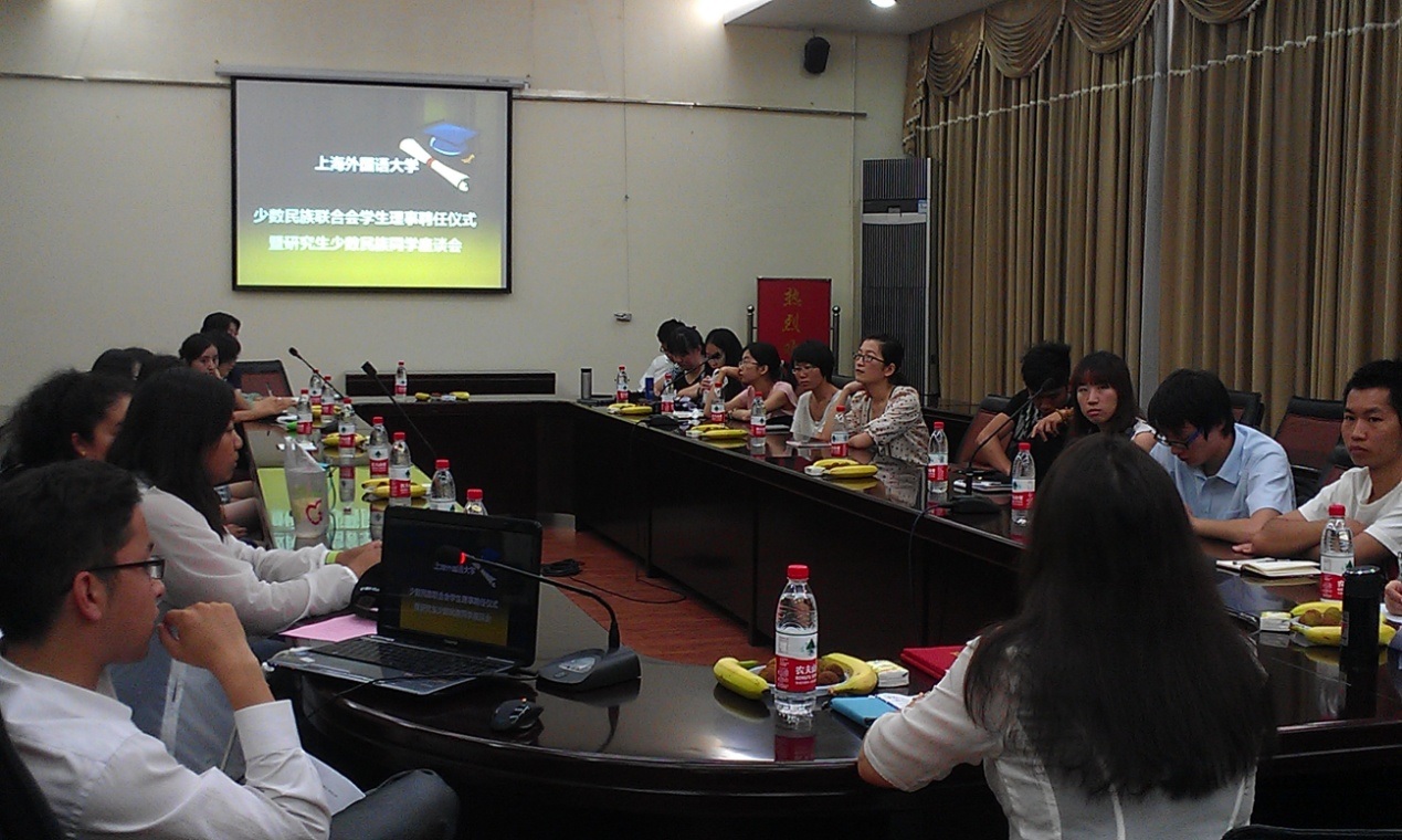 6月6日下午,上海外国语大学少数民族联合会研究生理事聘任仪式暨研究生少数民族同学座谈会在松江校区图文信息中心J110会议室举行。上海外国语大学少数民族联合会会长、中东研究所副所长马丽蓉教授、研究生部党总支副书记杨雪莲、学生管理办主任夏卡莉和研究生部相关工作人员出席了此次会议, 一同与会的还有来自各专业的19名研究生少数民族同学和“民族联”学生理事。