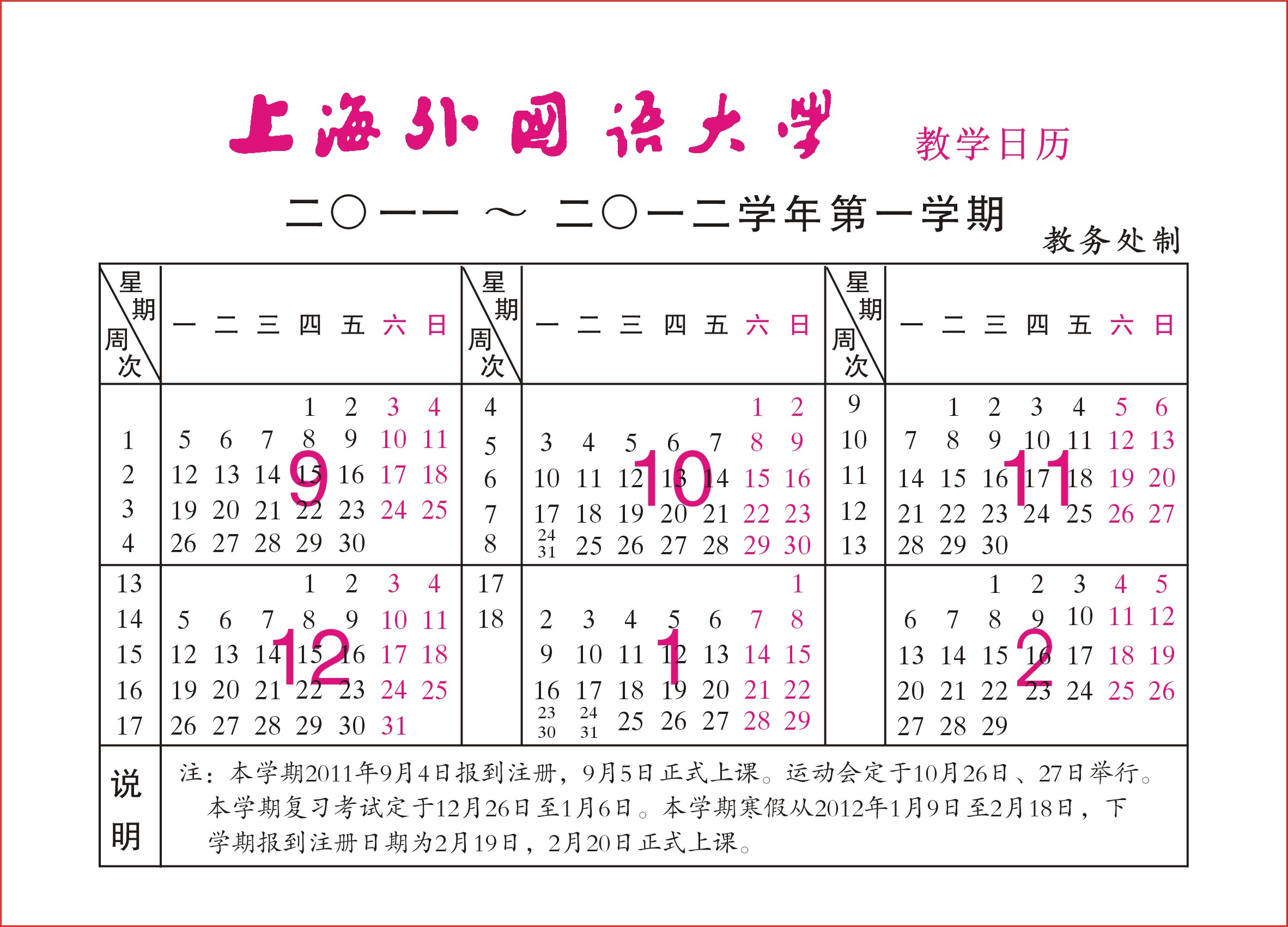 2011-2012学年第一学期校历