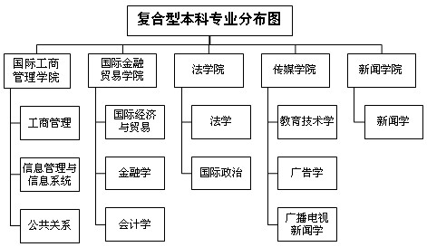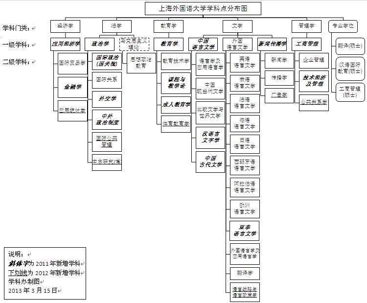 学校拥有2个一级学科博士学位授权点:外国语言文学、政治学,下设14个二级学科博士学位授权点(英语语言文学、俄语语言文学、法语语言文学、德语语言文学、日语语言文学、阿拉伯语语言文学、亚非语言文学、外国语言学及应用语言学、翻译学、国际组织、国际关系、外交学、中东研究、语言战略与语言政策学);2个博士后科研流动站:外国语言文学、政治学;7个一级学科硕士学位授权点:外国语言文学、政治学、应用经济学、教育学、中国语言文学、新闻传播学、工商管理,下设36个二级学科硕士学位授权点(英语语言文学、俄语语言文学、法语语言文学、德语语言文学、日语语言文学、西班牙语语言文学、阿拉伯语语言文学、欧洲语语言文学、亚非语言文学、外国语言学及应用语言学、翻译学、语言战略与语言政策学、语言学及应用语言学、中国现当代文学、比较文学与世界文学、汉语言文字学、中国古代文学、国际组织、国际关系、外交学、中外政治制度、国际公共管理、思想政治教育、国际贸易学、金融学、应用统计学、新闻学、传播学、广告学、企业管理、技术经济及管理、公共关系学、教育技术学、课程与教学论、成人教育学、体育教育学);3个专业硕士学位授权点:工商管理硕士(MBA)、翻译硕士(MTI)、汉语国际教育硕士(MTCSOL)。学科点分布图如下:
