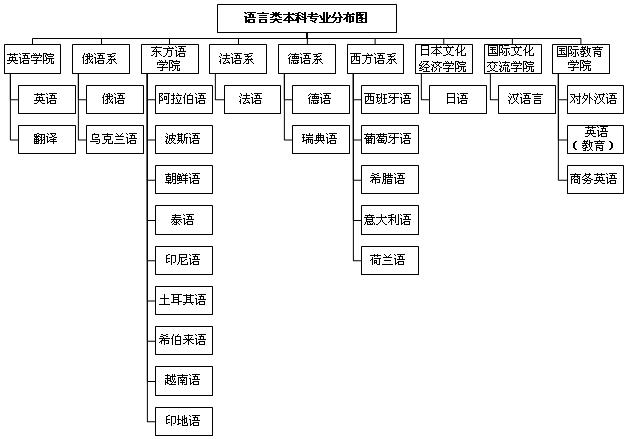 2012年,学校的学科建设有了进一步发展,学科专业布局更加完善。截至2012年12月,学校共有37个本科专业,其中25个语言类专业,12个非语言类专业。25个语言类专业涵盖22个语种,分别为:英语、俄语、德语、法语、西班牙语、阿拉伯语、日语、意大利语、葡萄牙语、希腊语、波斯语、朝鲜语、泰语、印度尼西亚语、瑞典语、荷兰语、越南语、希伯来语、乌克兰语、土耳其语、印地语、汉语、对外汉语、翻译、商务英语。其分布图如下: