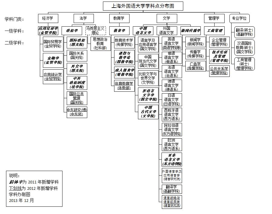 2013年,学校学科建设稳步发展,成绩显著。外国语言文学学科在全国第三次学科评估中名列第2,成功申报上海高校一流学科(A类)。通过“5+1”上海高校一流学科建设推进,学校学科布局更加优化,学科内涵进一步凝炼。通过6个一级学科《上海高校学科重点建设规划》的编制和一级学科评估,“5+1”一流学科被列入《上海高校创新能力提升计划引导项目》,促进了学科的可持续发展,提高了学科发展意识。为深入推进一流学科建设,同时推出学科建设动态推进机制,强化一流学科管理创新,建立了院系与研究院所协同研究机制。这些措施的出台使学科得到了可持续发展。
