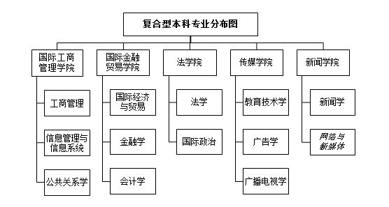 在2013年,学校开设了网络与新媒体专业。到目前为止,复合型专业由2012年的12个增加到13个:工商管理、信息管理与信息系统、公共关系学、国际经济与贸易、金融学、会计学、法学、国际政治、教育技术学、广告学、广播电视学、国际新闻、网络与新媒体。
