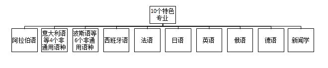 10个国家级特色专业在2013年顺利通过了国家检查。通过建设,10个特色专业得到进一步发展,夯实了专业基础,强化了人才培养能力:阿拉伯语、非通用语种群(意大利语、葡萄牙语、希腊语、荷兰语4个语种)、非通用语种群(朝鲜语、波斯语、泰国语、印尼语、希伯来语、越南语6个语种)、西班牙语、法语、日语、英语、俄语、德语、新闻学。