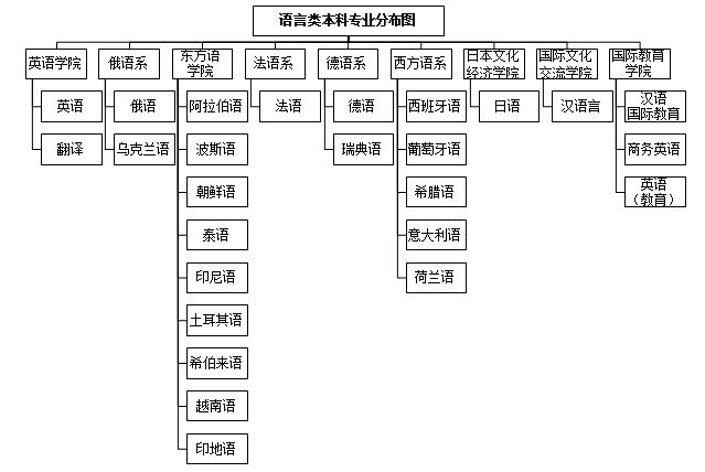 至2013年年底,学校有22个语种:汉语、英语、俄语、乌克兰语、阿拉伯语、波斯语、朝鲜语、越南语、泰语、印尼语、土耳其语、希伯来语、印地语、法语、德语、瑞典语、西班牙语、葡萄牙语、希腊语、意大利语、荷兰语、日语。