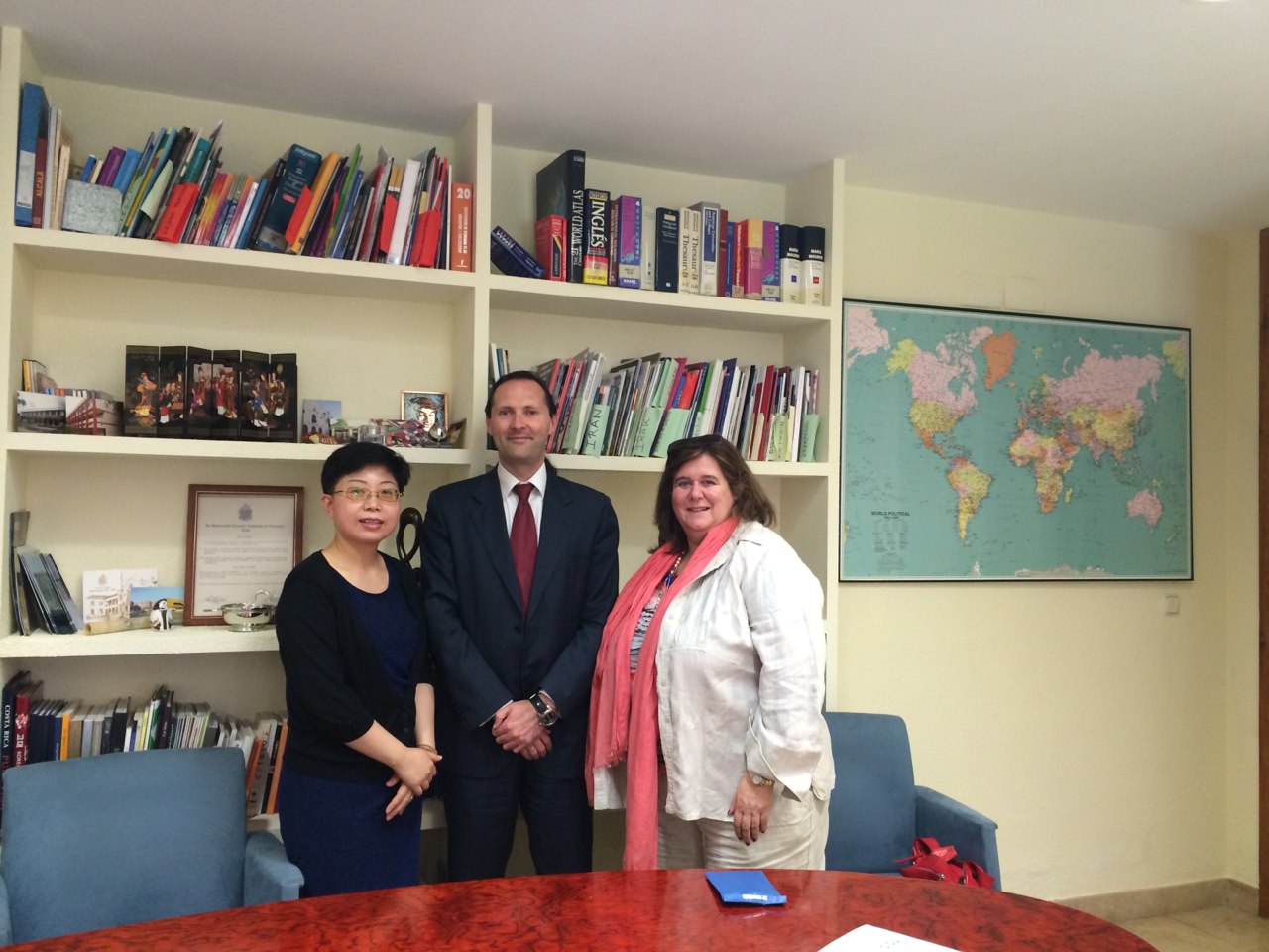 7月2日正在西班牙参加西班牙语言与文化研究项目(Q2810018J)的西方语系主任于漫教授拜访了西班牙阿尔卡拉大学新任国际关系副校长Miguel Ángel Sotelo Vázquez先生及该校基金会及经济学院负责人María Teresa del Val Nuñez教授。在和谐友好的气氛中,双方就如何进一步落实两校联合举办西班牙语专业本科教育项目达成多项共识。于教授向副校长及项目负责人转达了我校的致意和问候,介绍了我校的办学理念和专业特色,分享了两校自2001年建立起来的形式多样、层次较高的教学和科研合作交流项目的成功经验,表达了希望进一步推动由中华人民共和国教育部正式批复的这一中外合作办学项目的意愿,转达了我校对西班牙阿尔卡拉大学来访的诚挚邀请。副校长Miguel Ángel Sotelo Vázquez感谢上外的盛情邀请,表示将着手安排代表团的访问,明确了将进一步深化两校多年来业已建立起来的良好合作关系,努力提升双方合作水平。