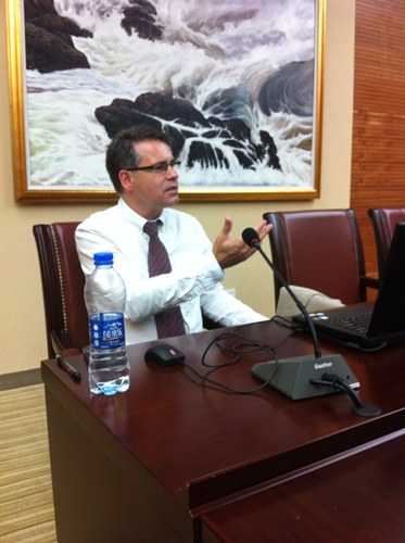 Vickery教授首先介绍了华威大学文化政策研究方向的相关成果与研究进展,就文化政策研究的对象、学者对这一课题的理解、文化政策在当前时代背景下的重要性、中国的地位等问题进行了细致而深入的阐述,并逐一介绍了文化政策研究中心的学者正着手进行的项目供与会老师了解。同时,Vickery教授还与各位老师探讨了他十分关心的中国城市文化建设问题,特别是新兴的创意文化产业园区。我校英国研究中心高度重视文化政策研究,在英国研究总体规划中特别突出了中英文化政策与文化产业研究的重要性。双方研究人员积极讨论,互通有无,学术讨论氛围极为热烈。