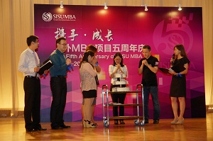 为了庆祝上外MBA项目成立五周年,校友会特地准备了庆生蛋糕。上海外国语大学国际工商管理学院副院长、MBA中心执行主任潘聪老师以及四届学生联合会主席上台同切蛋糕,全场齐唱生日歌,共同为上外MBA庆生,将会场气氛推向了高潮。