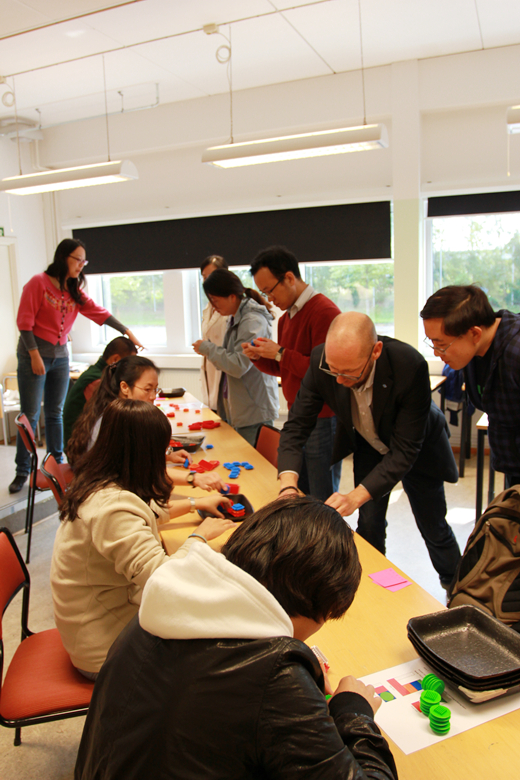 “实物模拟实践”(Simulation)无疑是每届瑞典之行最令同学们印象深刻、收获最大的环节。“模拟”被设计成一个小游戏:20名同学随机分为两组,用乐高积木充当道具,通过模拟从接订单、采购原材料、加工生产、质量控制、交货等环节来实现公司盈利。整个“模拟”持续3小时,每组要经营三年,每年的“模拟”限时为12分钟。共进行3轮,盈利大的那组获胜。这个游戏看似非常简单,实际上却把运营管理的各个流程进行了模拟,除了设立企业的目标,找到适合的客户,还需要有良好的计划和流程,每一步的质量控制、成本控制也非常重要。此外,也认识到各部分员工之间的沟通以及一个领导对于团队的重要性也不容忽视。