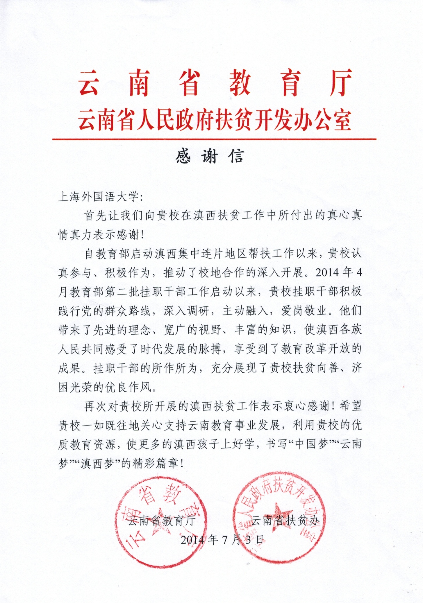 为促进滇西扶贫开发,我校自2013年起积极响应教育部号召,认真做好选派干部到滇西边境贫困山区挂职的工作,截止目前已有两名干部先后赴云南省普洱市墨江哈尼族自治县挂职担任副县长,挂职干部政治过硬、作风正派、乐于奉献、爱岗敬业,充分展现了扶贫向善、济困光荣的优良作风。同时,在校党委的统一领导和协调下,我校各部门和院系也积极支持和配合滇西扶贫工作,获得了教育部、云南省教育厅、扶贫办及当地政府、群众的一致好评。(党委组织部) 附:云南省教育厅、扶贫办感谢信 26.1K