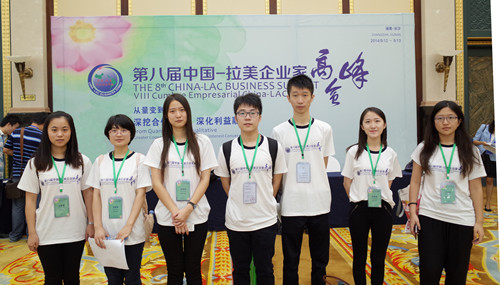 9月12日至9月13日,第八届中国—拉美企业家高峰会在湖南长沙举行,我校西方语系派出8名西班牙语志愿者进行翻译工作,陪同拉丁美洲多国部长、大使及参赞等贵宾与会,并积极投身企业洽谈会协助中拉企业沟通,圆满完成任务。峰会吸引了近三十个拉美和加勒比国家及中国二十多个省市的八百余名企业家齐聚长沙。