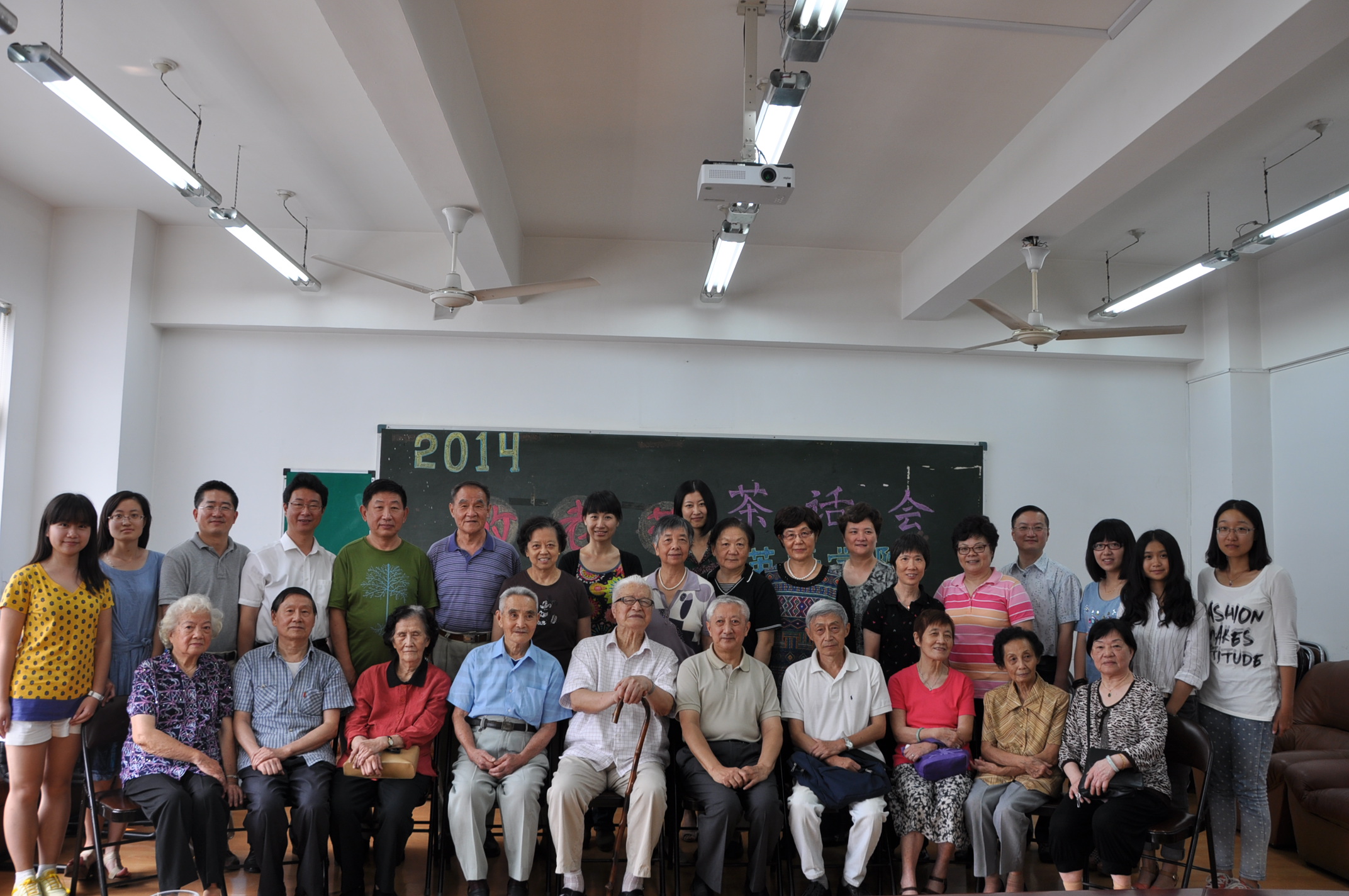 随后,各位老教师们相继对学院的多方面的工作提出了解和慰问,并提出他们的见解和建议。虽然老教师们当中很多已是八十多岁,甚至是九十多岁的高龄,但是仍然不忘教育事业,时刻关注校院的发展建设,积极发挥余热。学院领导和青年教师们对老教师的认真态度和热忱精神所打动,纷纷感慨要向各位前辈学习,再接再厉,发扬前辈们的优良风范。学生代表们也都对各位老教师慕名已久,竞相来到老教师的身边,交流攀谈,领略名师的风采;青年教师们也纷纷向老教师讨教取经,新老教师之间交流心得,探讨教学方法;同时,学院领导和老师也不忘慰问老教师们的身体和生活,祝愿他们康健常在。整个会场欢声笑语,其乐融融。茶会话最后,李珮莹朗读了她倾心而作的四言长诗《教师乐》,回忆了自己从教的一生,心甘如怡,其乐无穷。诗歌的最后几句,“培育人才,重在素质。心中有爱,默默耕耘。献身教育,其乐无穷。若有来世,再执教鞭。”传达了在场各位老师的心声,引发了大家持久而热烈的掌声。