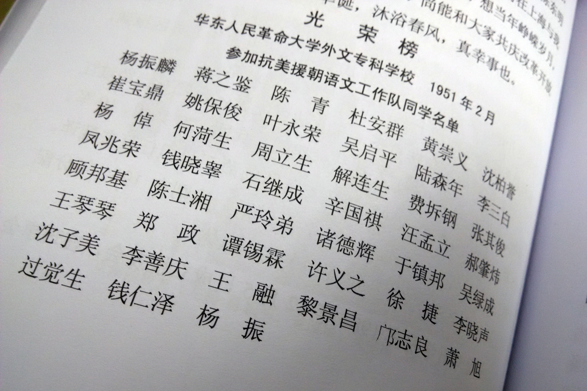 据了解,陈青先生于1950年12月考取了华东人民革命大学附设上海俄文学校的英文班。当时正逢朝鲜战场形势紧张,国家急需英语人才,学校英文班学员响应国家号召,经过短期强化培训后,成立由44名学员志愿组成的“抗美援朝语文工作队”,陈青先生就在其中。虽然他那时已经成家并有了两个孩子,但依然克服困难,舍小家为国家,奔赴前线。时任校长姜椿芳亲自赴北火车站为44名热血青年送别。