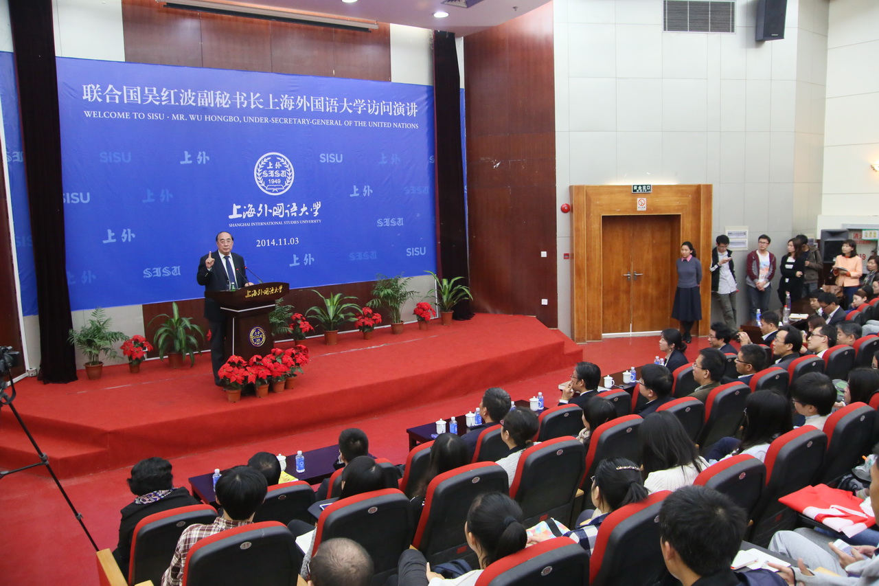 (上外新闻网讯)11月3日,联合国主管经济和社会事务的副秘书长吴红波大使莅临上海外国语大学考察,并向上外师生发表演讲。校党委书记姜锋陪同考察。副校长冯庆华主持演讲,校领导李月松、张峰等出席活动。