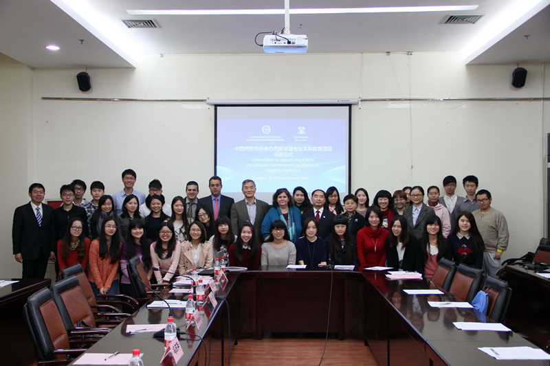 2014年11月10日,上海外国语大学与西班牙阿尔卡拉大学西班牙语专业本科合作教育项目在松江校区举行开班仪式。我校冯庆华副校长,西班牙阿尔卡拉大学基金会及经济与企业管理学院院长María Teresa del Val女士,该校亚太地区代表 Rafael Martín先生,首门课程授课专家Rafael Castaño先生,我校对外交流合作处蒋昕宇老师,西方语系陆经生教授等教师以及学生代表参加了仪式。西方语系系主任于漫教授主持了仪式,并介绍了合作项目的背景和获批过程。