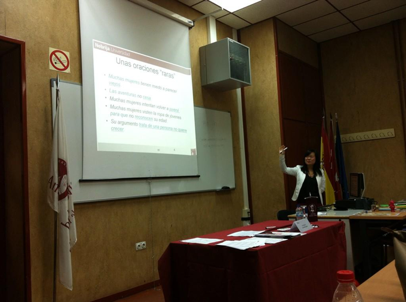 担任马德里孔子学院中方院长的陈芷副教授应邀做了题为“中国学生口语和书面表达中缺乏衔接现象的哲学根源和应对策略”的讲座,介绍了中国学生在西班牙语表达中易犯的衔接错误的主要表现形式,指出这些错误与汉语一词兼多类,缺乏词形变化,以及句法上讲意合、重并置、少连接的特点紧密相关,由此联系到中国人全息的思维倾向和意会的理解模式。而教师面对学生的上述错误,应作“如是”之观,一方面采取宽容的态度,另一方面带领学生通过不断操练内化目标语的语言体系。陈芷老师妙语连珠的演讲引起了全场的热烈反响,参与者们不但对中国学生的学习难点有了更深入的了解,还对中国的语言文化产生了浓厚的兴趣。