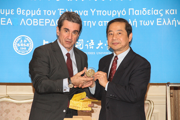 曹德明校长首先代表全校师生向教育部部长等人的到来表示了热烈欢迎。接着,他简要介绍了我校外语专业建设的传统优势和国际化办学的举措,随后向部长先生介绍了我校希腊语专业的基本情况,并衷心感谢希腊政府尤其是希腊教育部以及希腊驻华使领馆长期以来对我校希腊语专业在专业建设、师资培养、语言教学等方面的大力支持。曹校长表示,上外非常愿意选派学生和青年教师赴希腊留学,希望希腊教育部能够在学生交流、教师读博、派遣外教方面给予进一步的帮助和支持,同时欢迎希腊教师和学生来我校学习交流。最后,他介绍了我校的欧盟研究中心,希望在国别区域研究方面与希腊有关教育机构开展合作。