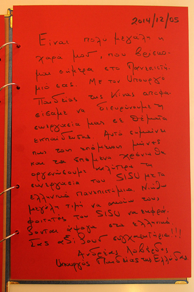 会见最后,部长先生在留言簿上题词,对于我校的希腊语专业发展提出了殷切的期望。曹校长与部长先生互赠礼物后,部长先生与全体嘉宾及学生代表合影留念。