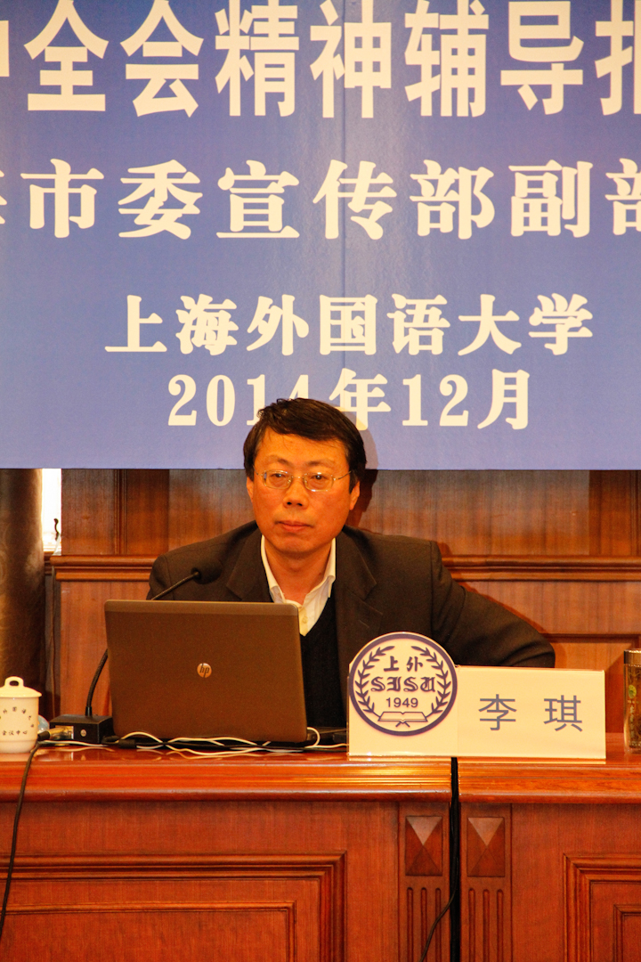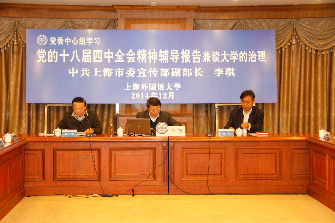 12月11日下午,上海外国语大学党委中心组举行集体学习,中共上海市委宣传部副部长李琪教授应邀做了题为“党的十八届四中全会精神学习”的辅导报告。校领导姜锋、王静、冯庆华、张峰、杨力、林学雷、庄智象等出席报告会。学习报告会由校党委委员、党委宣传部部长陈万里主持。