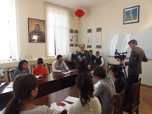 撒马尔罕市电视台特意赶来拍摄孔子学院的专题节目。采访了中方院长刘涛、孔院本土教师赫萝拉和撒外汉语专业学生别克。中方院长刘涛介绍了孔子学院的成立宗旨和工作任务,以及孔子学院对于建设丝绸之路经济带的重要意义。孔院本土教师赫萝拉对于乌兹别克人学习汉语的意义和好处发表了自己的看法。撒外汉语专业学生别克畅谈了自己在北京的留学经历,表达了对中国文化的仰慕之情。撒马尔罕电视台对孔院课堂教学进行了拍摄报道。