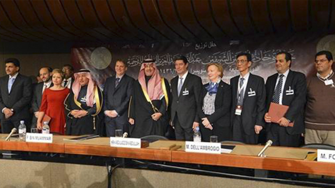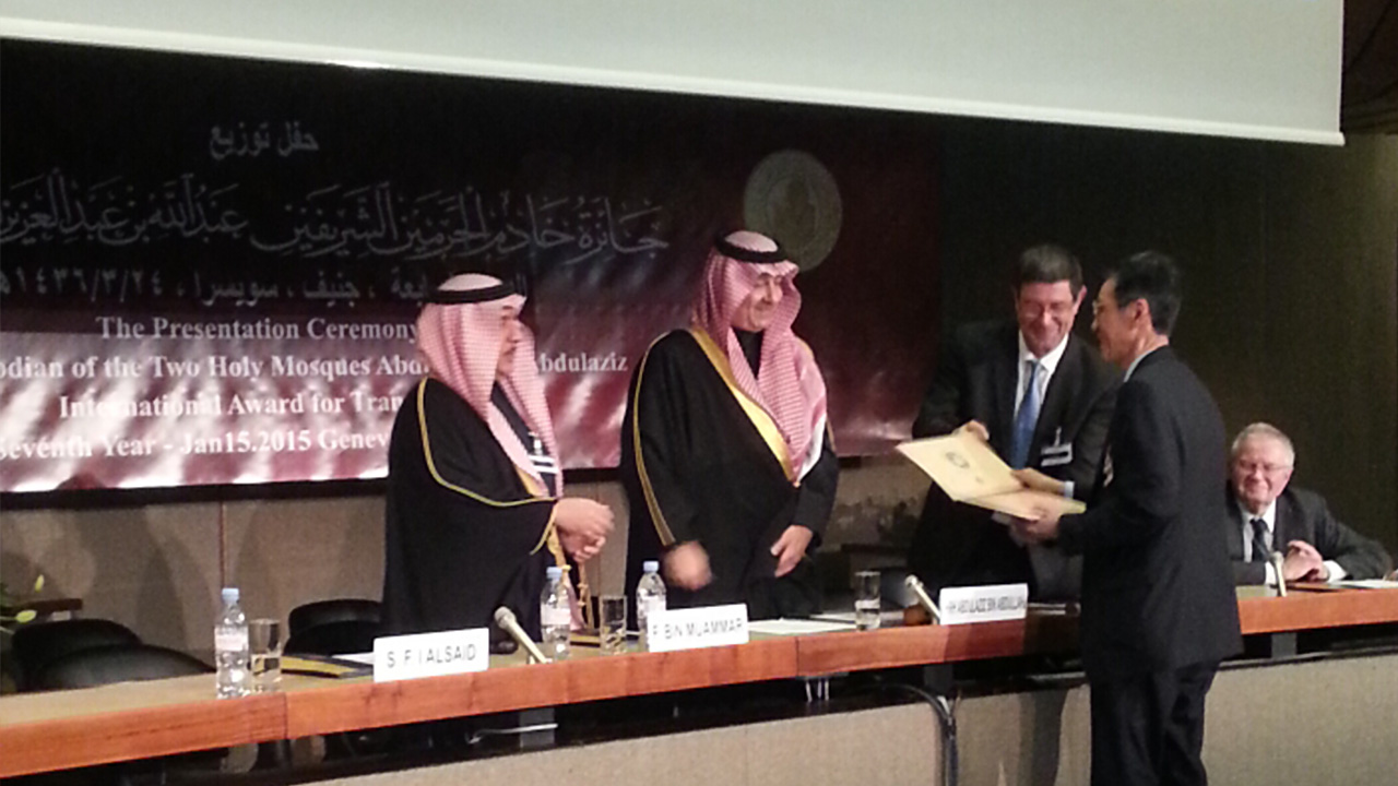 1月15日,第七届阿卜杜拉国王世界翻译奖颁奖典礼在瑞士日内瓦举行,上海外国语大学中东研究所朱威烈教授出席典礼,接受沙特外交副大臣、阿卜杜拉国王世界翻译奖董事会主席阿卜杜勒·阿齐兹·本·阿卜杜拉亲王颁发的个人贡献奖。