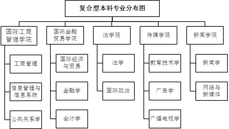 至2014年12月,学校有13个复合型专业:工商管理、信息管理与信息系统、公共关系学、国际经济与贸易、金融学、会计学、法学、国际政治、教育技术学、广告学、广播电视学、国际新闻、网络与新媒体。