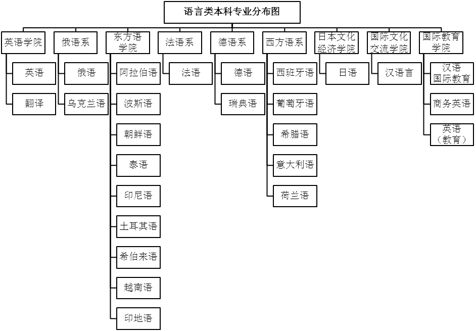 至2014年12月,学校有22个语种:汉语、英语、俄语、乌克兰语、阿拉伯语、波斯语、朝鲜语、越南语、泰语、印尼语、土耳其语、希伯来语、印地语、法语、德语、瑞典语、西班牙语、葡萄牙语、希腊语、意大利语、荷兰语、日语。
