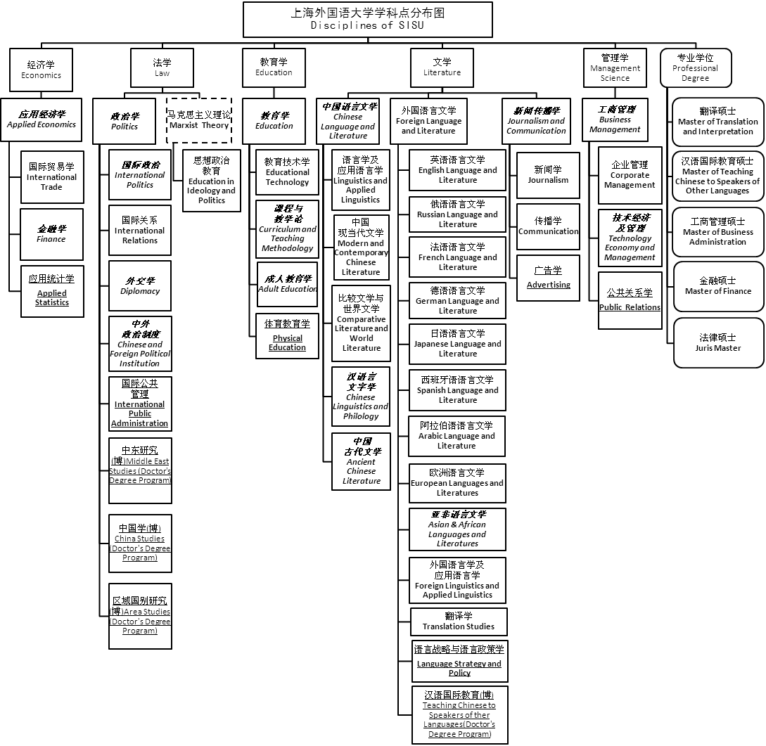 至2014年12月,学校拥有7个一级学科硕士点(外国语言文学、政治学、新闻传播学、工商管理、应用经济学、教育学、中国语言文学),下设36个二级学科硕士点(国际贸易学、金融学、应用统计学、国际政治、国际关系、外交学、中外政治制度、国际公共管理、思想政治教育、教育技术学、课程与教学论、成人教育学、体育教育学、语言学及应用语言学、中国现当代文学、比较文学与世界文学、汉语言文字学、中国古代文学、英语语言文学、俄语语言文学、法语语言文学、德语语言文学、日语语言文学、西班牙语语言文学、阿拉伯语语言文学、欧洲语言文学、亚非语言文学、外国语言学及应用语言学、翻译学、语言战略与语言政策学、新闻学、传播学、广告学、企业管理、技术经济及管理、公共关系学),5个专业硕士学位点[工商管理硕士(MBA)、翻译硕士(MTI)、汉语国际教育硕士(MTCSOL)、金融硕士(MF)、法律硕士(JM)]。