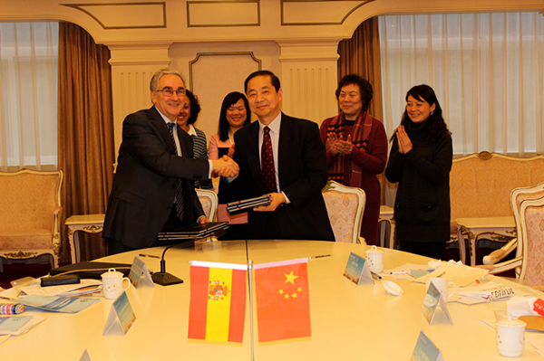 两个多小时气氛热烈而卓有成效的会谈结束后,曹德明校长和JOSE MARIA SANZ校长共同签署了关于合作建设马德里孔子学院的新版执行协议。