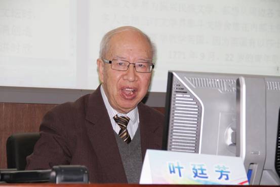 叶廷芳研究员做了题为“歌德的‘全人’人格和人类情怀”的报告。他主要从三方面阐述了歌德是一位全人式的天才诗人,而且是目光远大、拥抱全人类的文化巨人。他认为,在当今的时代境遇下,我们加强歌德的学习与研究,进而把歌德的博大胸怀和世界眼光变成“地球村“的主导精神是非常必要和紧迫的。