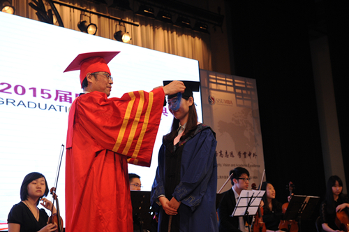 短暂的休场后,毕业生与到场嘉宾共同迎来了本次典礼最隆重的一刻——拨穗、颁发毕业证书环节。同学们逐一走上主席台,姜锋书记为每位毕业生一一拨穗、颁发毕业证书并合影留念,同学们非常满足——上海外国语大学2015届MBA毕业典礼也定格在这一瞬间。