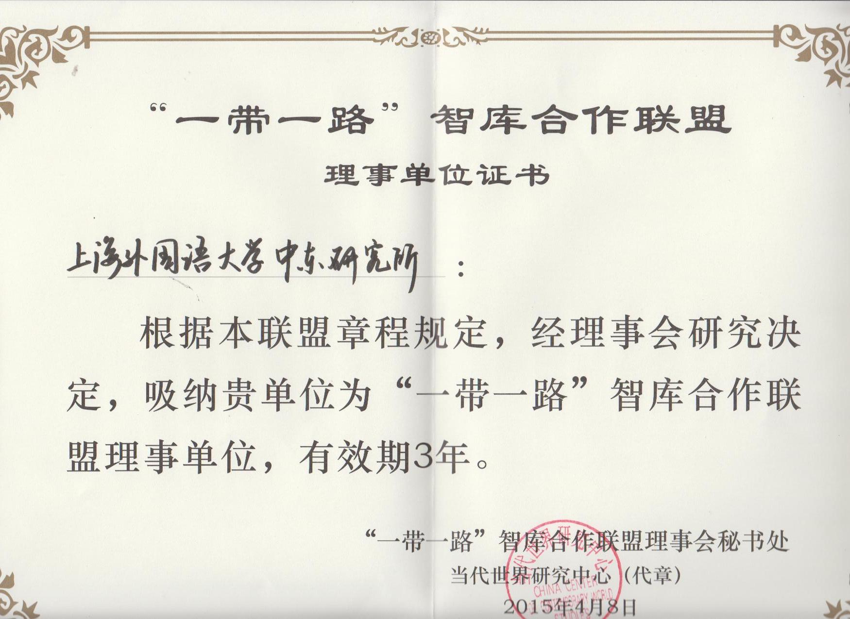4月8日,“一带一路”智库合作联盟理事会成立会议暨专题研讨会在京举行,来自全国各地50多家智库和研究机构的代表出席会议。上海外国语大学中东研究所成为“一带一路”智库合作联盟理事单位。据悉,此次智库合作联盟理事单位共56家,其中上海地区智库4家。