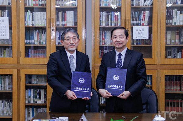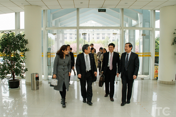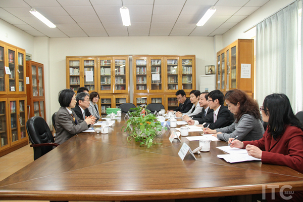 4月13日,上午代表团一行来到上外松江校区,受到校长曹德明的热烈欢迎。两位校长就相互确立战略合作伙伴关系以及深化两校间全方位、多层次的合作进行会谈。曹德明首先介绍了上外的学科及专业建设情况,阐述了上外近年来在对接国家战略方面所进行的改革及取得成就。上外自上世纪80年代以来整合优质外语学科资源,创新复合型人才培养模式,在立足于强化外语学科优势的前提下,构建多学科联动发展格局。曹德明还就上外国际化人才培养、学生就业、以及中东研究、“中国学”等优势和特色项目等情况作了介绍,并提议今后与东京外大一起,联合韩国一流外国语大学开展高端翻译和国别区域研究人才的联合培养,合作举办国别区域研究论坛等学术活动。