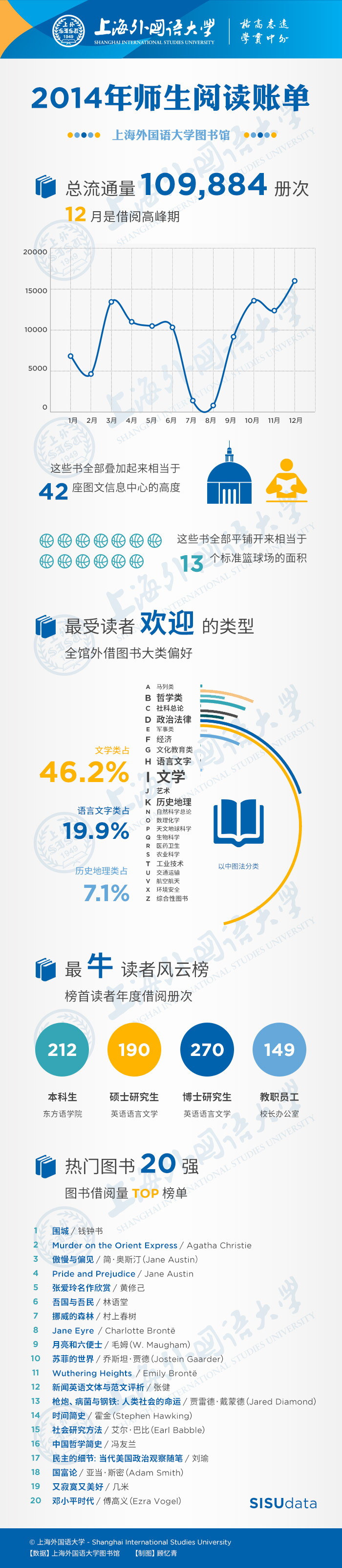 在这个特别的日子里,上海外国语大学官方微信平台(订阅号:sisu1949)微校刊《西索》(SISU)联合上外图书馆共同发布【2014年师生阅读账单】。让我们通过一组大数据分析,回眸你我共同的校园阅读生活。今天,你借书了吗?(顾忆青)
