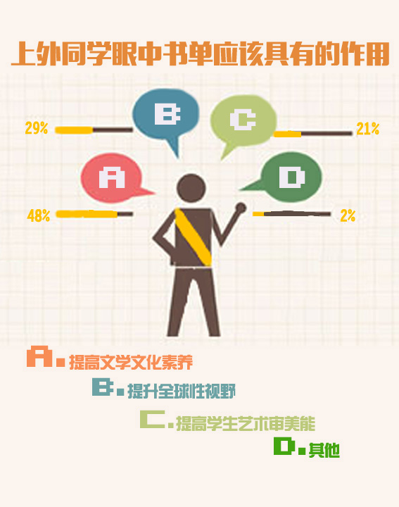 此外,据统计,大多数同学希望“上外书单”拥有的书籍数目能在20-50本,中英文比例平均约为2:1。也有不少同学提出,书单的关键在于其推荐书籍的质量。