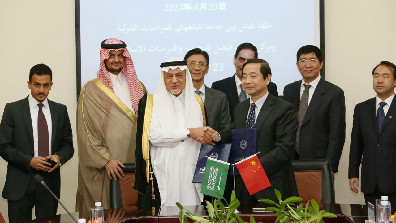 4月23日,沙特阿拉伯王国图尔基·费萨尔亲王(Prince Turki al-Faisal)一行访问上海外国语大学。校长曹德明、副校长杨力和中东研究所名誉所长朱威烈教授等热情接待了沙特贵宾。宾主双方共同出席了上海外国语大学授予图尔基·费萨尔亲王名誉博士学位仪式。