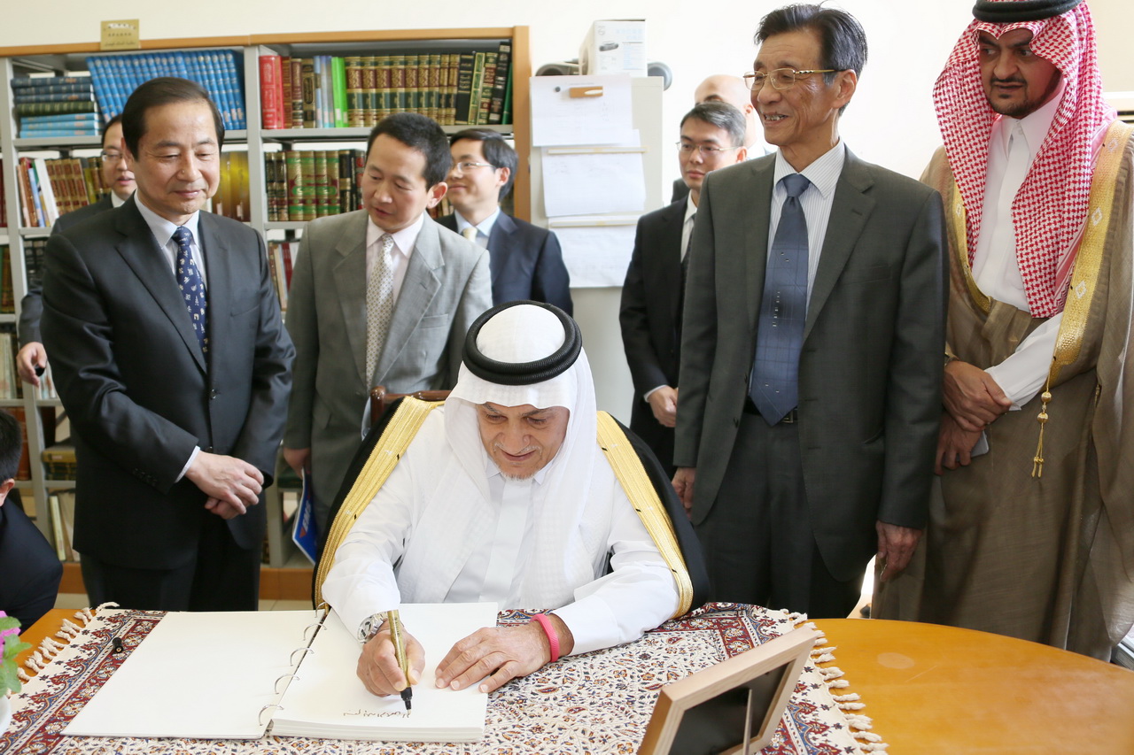 当天上午,亲王车队驶抵松江校区东方语学院。校长曹德明在学院门前迎接亲王一行。亲王一行首先来到东方语学院费萨尔国王图书馆,在沙特费萨尔国王伊斯兰研究中心捐赠的六千册图书前驻足,听取学院老师的介绍,并为东方语学院阿拉伯语系题词。随后,亲王一行走进教室,与上课师生亲切交流,亲王对学生的阿拉伯语水平赞赏有加。