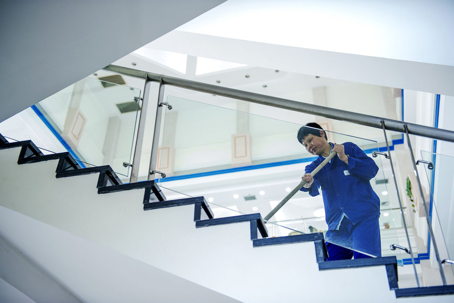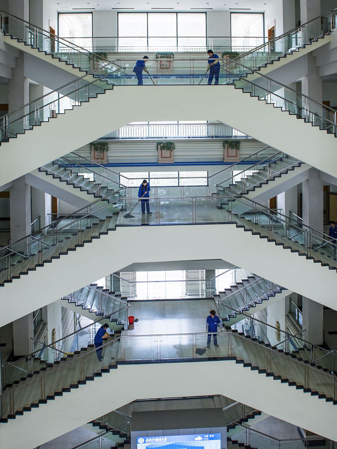 保洁阿姨是教学楼里最常见到的人,每天早上7点不到,她们就开始了一天辛苦的工作,一直到下午5点。她们负责打扫整个校园和十几栋教学楼。仅就虹口校区而言,需要打扫的公共教室就有73间之多,37名保洁员全年打扫约12500次,校园保洁工作从清晨六时三刻开始,风雨无阻。