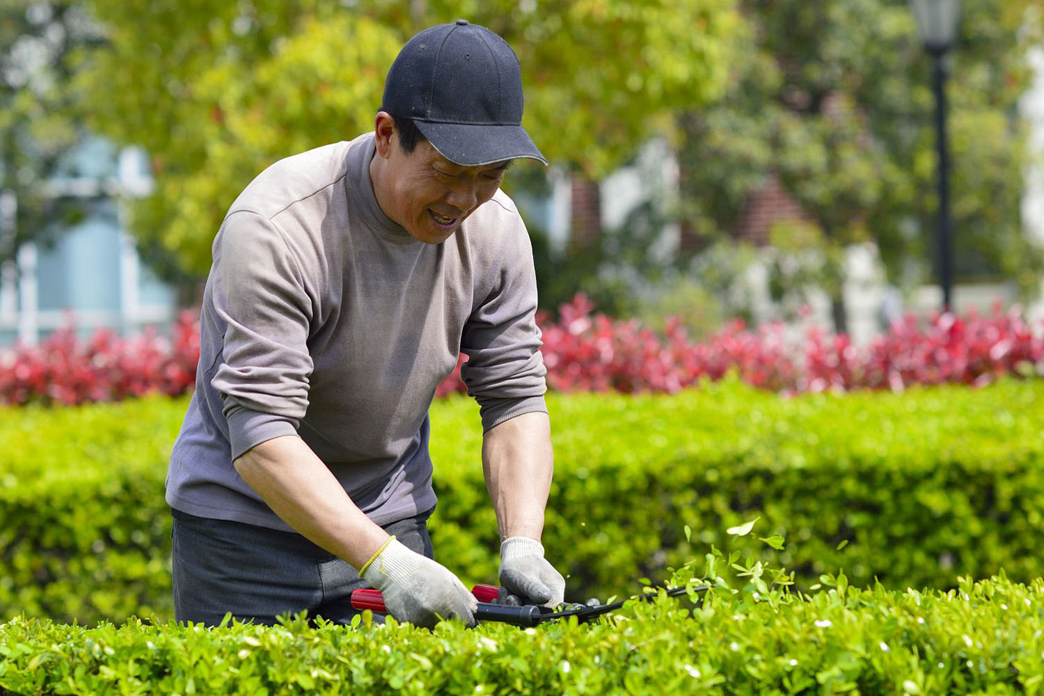 当我们在烈日炎炎中走过校园,不停找树荫凉快自己时,总有一些人正挥汗如雨地在大太阳底下工作。校园绿植不是天生就是现在的模样,它是绿化组师傅们移植、浇水、修剪、除虫、加固的成果,师傅们辛勤的汗水不仅换来美丽的环境,更为学校节省了开支(平均3.89元/㎡的维护保养费远远低于8元/㎡的市场价)。为了不影响师生的工作学习,早上6点刚过,草皮打草就开始了,而修剪树枝、加固高大树木等,只能利用休息日进行。