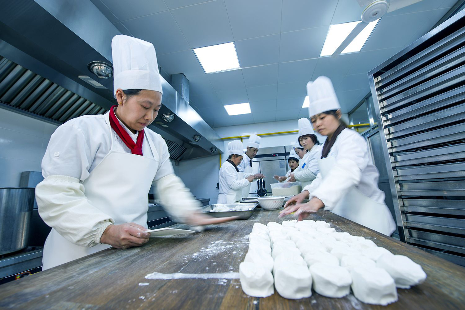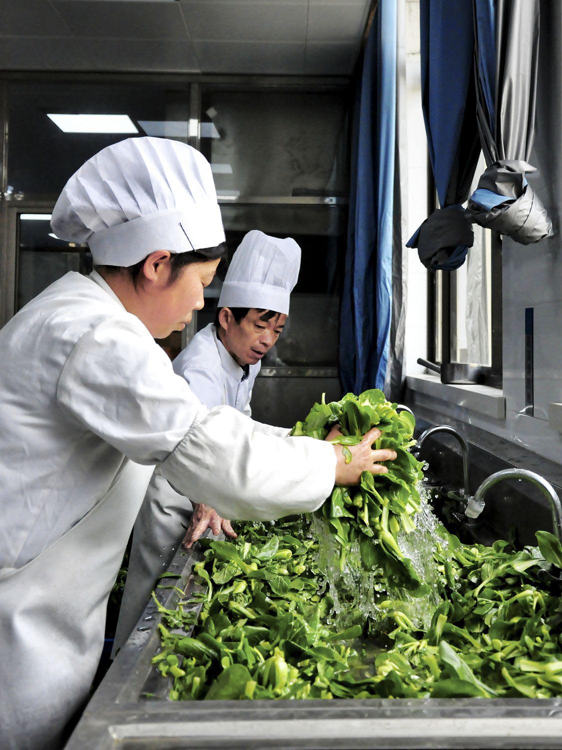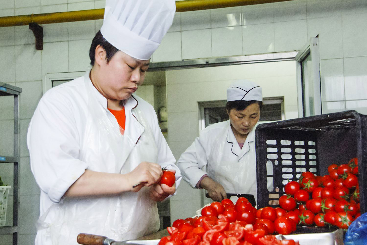 每天清晨,松江校区的第一声早安,是食堂里哗哗的洗菜声。凌晨三点半,当师傅们忙得热火朝天时,离天亮起码还有个把小时。上海的冬天,洗菜水是彻骨的冷;炎热的夏日,炉灶边的温度可升至惊人的45度。在不到三小时的时间里,600多只葱油饼、锅贴、生煎和100多笼小笼新鲜出炉。松江校区食堂每天需要多少瓜果蔬菜?有一个关于番茄的数据是100斤,那意味着要给300多个番茄去蒂切块,然后让它们成为一天两顿正餐、每顿25道菜、每道菜炒3锅的原料之一。