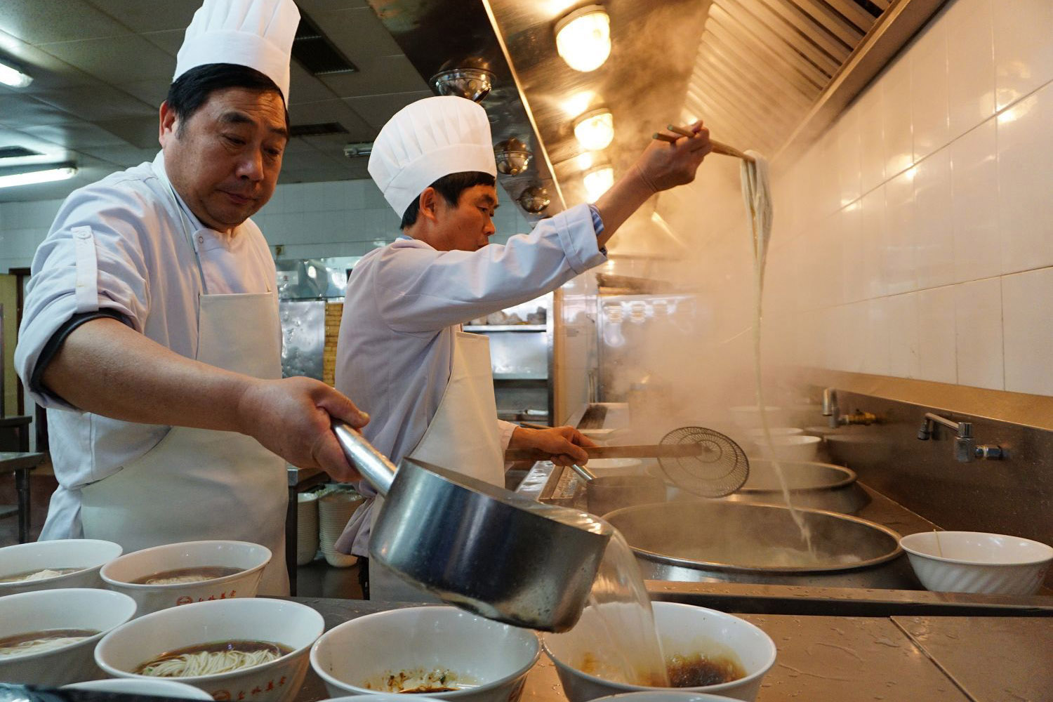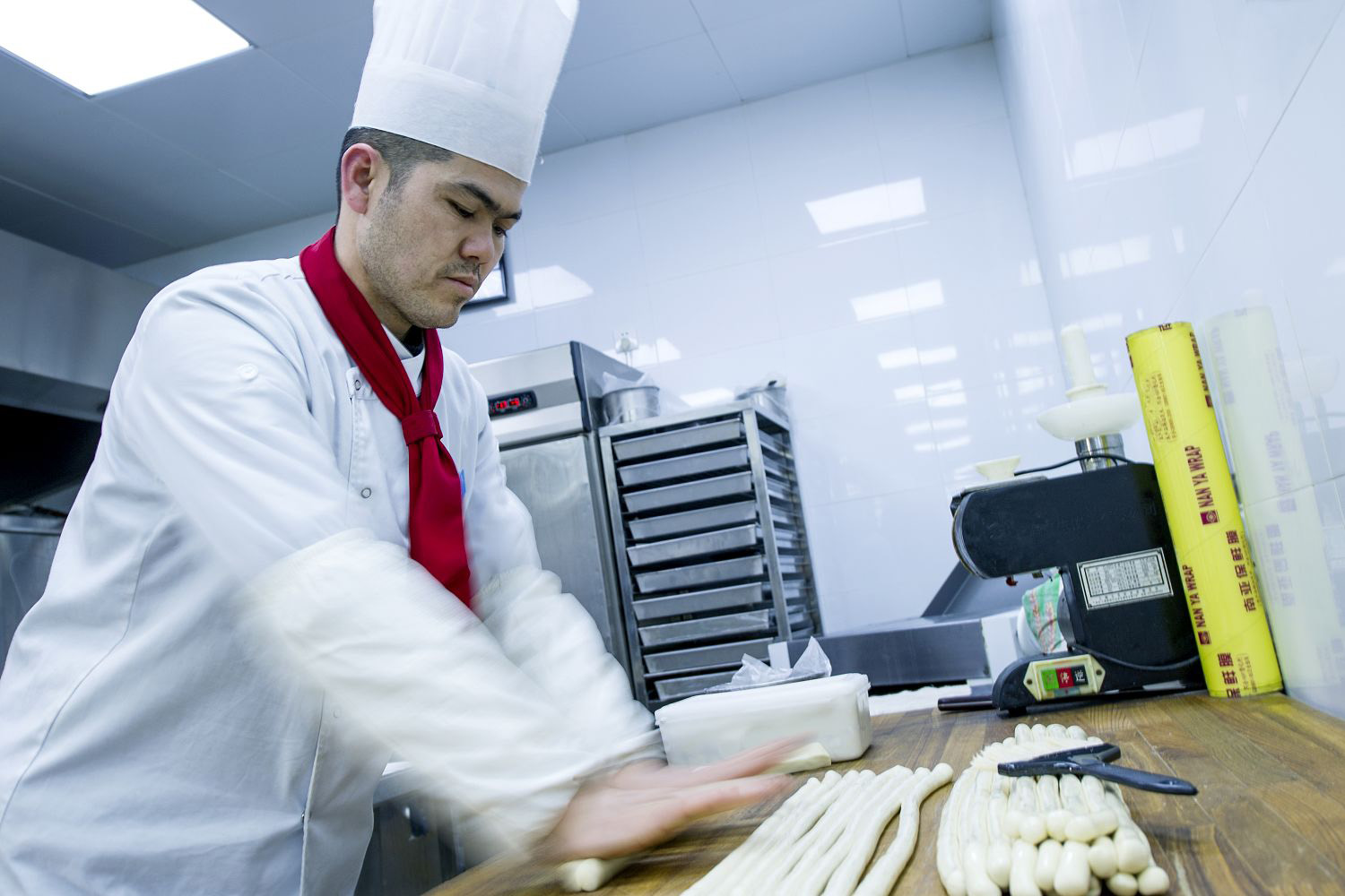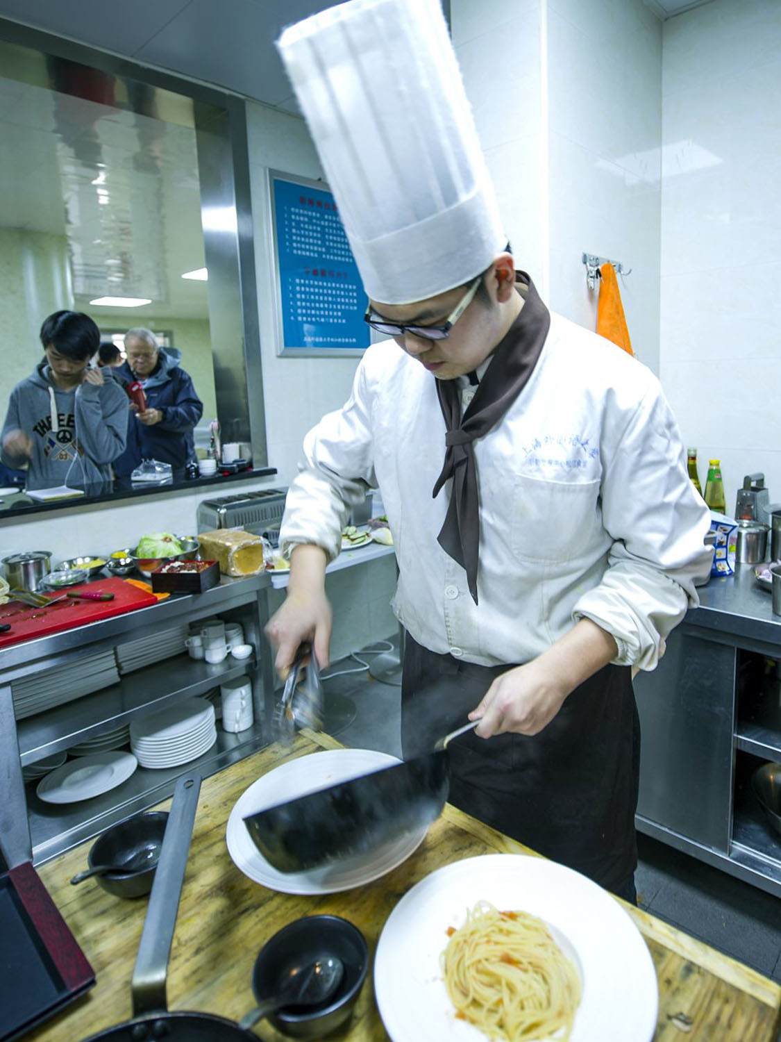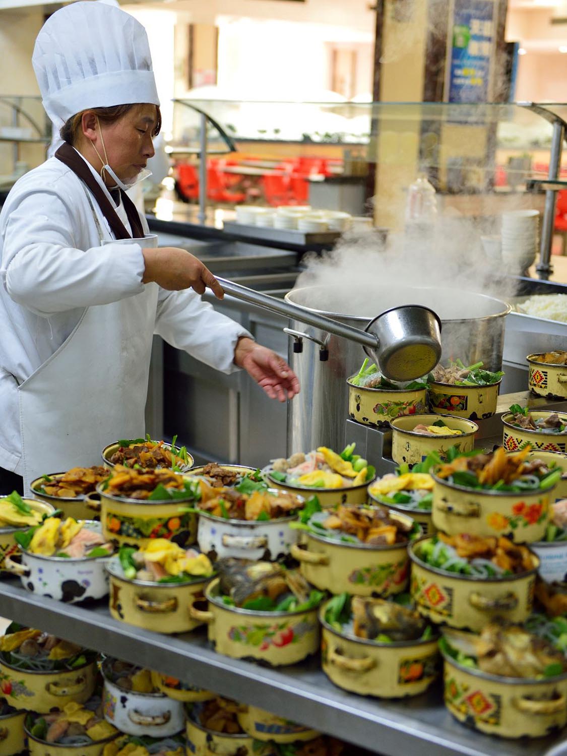 每天清晨,松江校区的第一声早安,是食堂里哗哗的洗菜声。凌晨三点半,当师傅们忙得热火朝天时,离天亮起码还有个把小时。上海的冬天,洗菜水是彻骨的冷;炎热的夏日,炉灶边的温度可升至惊人的45度。在不到三小时的时间里,600多只葱油饼、锅贴、生煎和100多笼小笼新鲜出炉。松江校区食堂每天需要多少瓜果蔬菜?有一个关于番茄的数据是100斤,那意味着要给300多个番茄去蒂切块,然后让它们成为一天两顿正餐、每顿25道菜、每道菜炒3锅的原料之一。