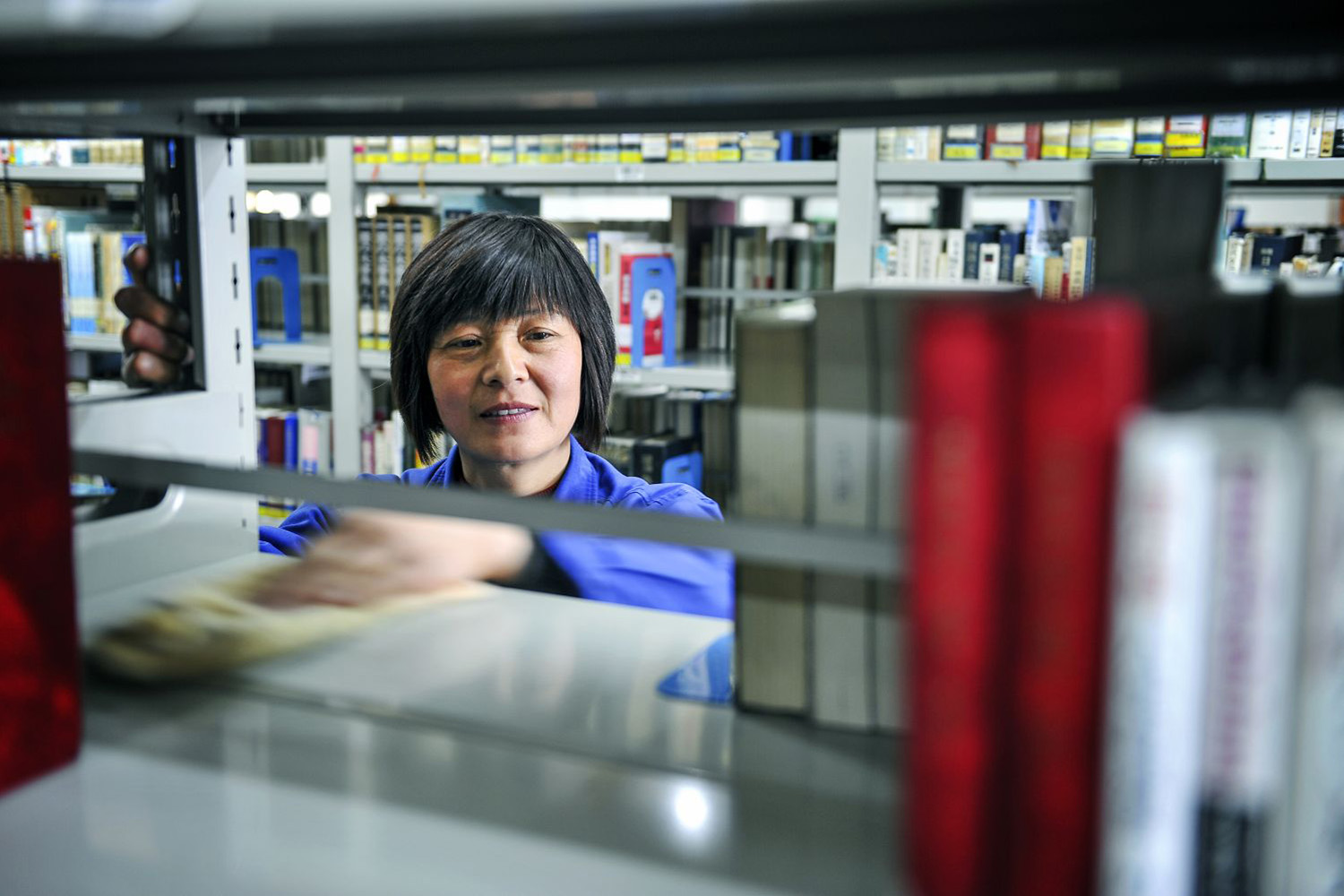 “理架”是一份非常不轻松的活,图书馆要求每一层书架都必须排列整齐,书与书之间不能有缝隙,更不能东倒西歪,拿图书馆的行话就是“每一架书都要像士兵接受检阅一般”,使读者能根据索书号直接找到需要的书籍。