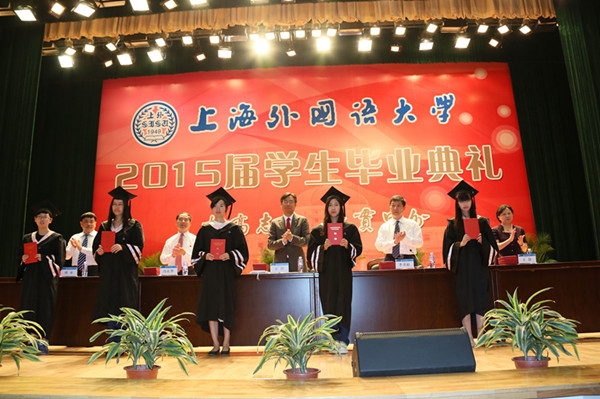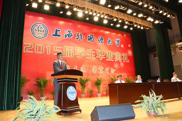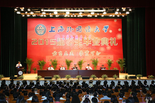 2015年6月18日上午,上海外国语大学2015届本科学生毕业典礼在教育会堂隆重举行。校领导姜锋、李月松、王静、冯庆华、周承出席了毕业典礼。1475名本科毕业生怀着喜悦而激动的心情,经历了人生中具有里程碑意义的仪式。毕业典礼由校党委副书记李月松主持。
