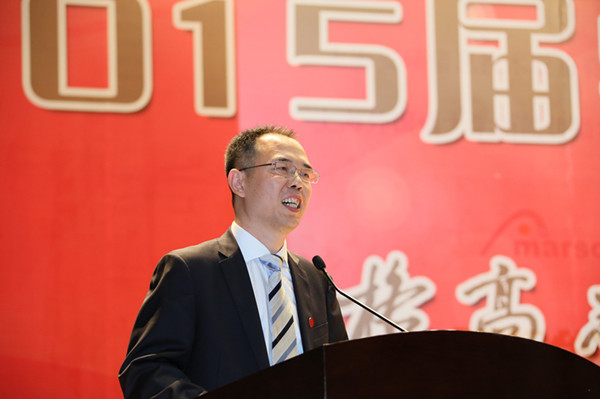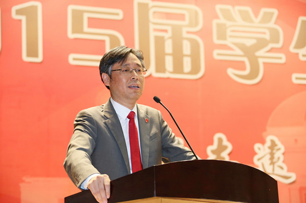 校党委书记姜锋代表学校向2015届毕业生致辞。他首先代表因公务在北京出差而无法出席毕业典礼的曹德明校长和学校教职工表达了对毕业生们的祝福,感谢教职员工、学生家长的共同付出。姜书记用平实的话语,从毕业生代表发言说起,他说“你们毕业了,母校为你搭建的舞台和空间也随之超越校园,任你在大千世界里展现。毕业了,你我之间的关联也由此超越了校园,从今后,母校牵挂着远行的你,母校非常在乎你。”