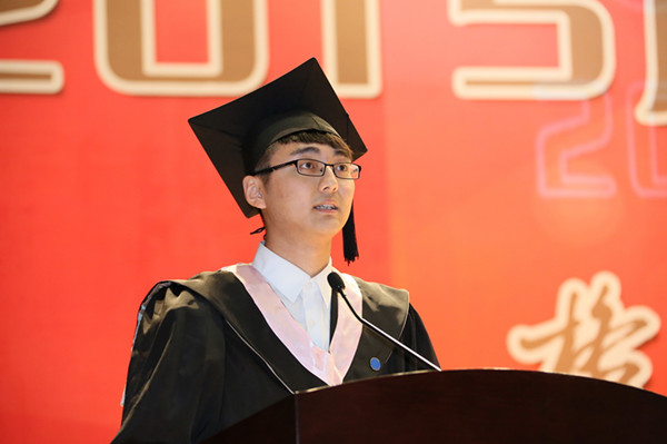 法学院孟言伦作为毕业生代表在发言中回顾了四年大学校园生活的许多细节,他非常感谢在上外四年遇到的所有人。他说,上外之于我们,是一种归宿,一种信仰,学校学到的用处最大的不是那些具体的知识点,而是三分对理想的执着,三分对真理的求索,三分开拓的勇气,还有一分厚德笃行;他表示将谨记母校“格远志远学贯中外”的校训精神,真诚待人、踏实做事。