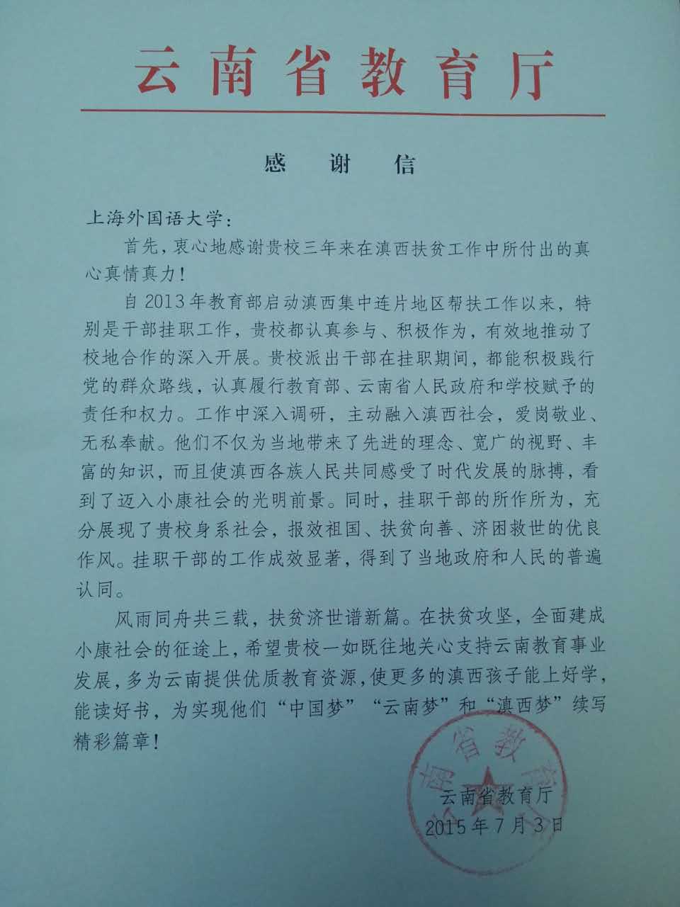 近日,云南省教育厅向上海外国语大学发来感谢信,表达对上外三年来滇西扶贫工作的衷心感谢。 上外自2013年起积极响应教育部号召,认真做好选派干部到滇西边境贫困山区挂职的工作,截至目前已有三名干部先后赴云南省普洱市墨江哈尼族自治县挂职,挂职干部乐于奉献、爱岗敬业,充分展现了扶贫向善、济困光荣的优良作风。(钱俊妮) 附:云南省教育厅感谢信