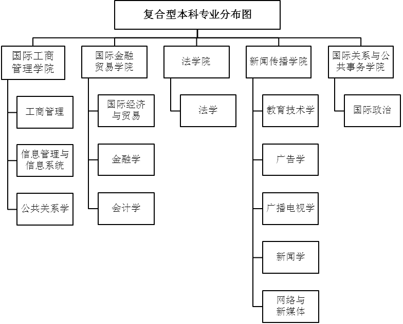 学校设有13个复合型专业:工商管理、信息管理与信息系统、公共关系学、国际经济与贸易、金融学、会计学、法学、国际政治、教育技术学、广告学、广播电视学、国际新闻、网络与新媒体。