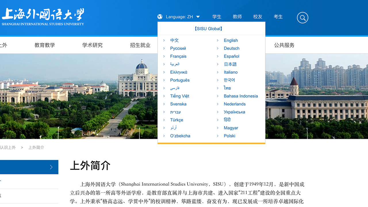 上外新版中文网站在界面UI设计上,与先前发布的上外多语种外文网站群保持一致,营构上外统一的视觉形象识别(VI),并采用响应式设计,兼容PC、平板和手机等多终端访问。同时,在页面设置多个切换入口,便于不同语言之间的无缝对接,充分反映学校“多语种+”办学理念。