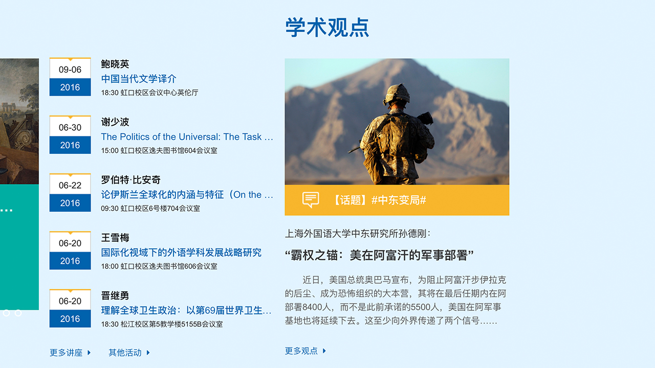 网站首页除了保留常规的新闻和活动发布栏目之外,还新增了学术观点栏目,旨在将上外学者在语言文化研究、区域国别研究等领域的智识成果,通过学术普及的方式,推向社会公众,更好地发挥大学智库的思想引领力。