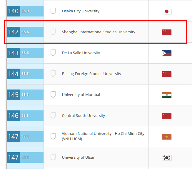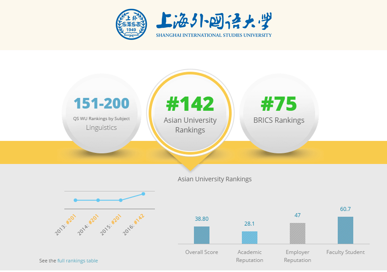 上海外国语大学(Shanghai International Studies University)排名显著提高,较去年跃升近60名,跻身亚洲第142位,在中国大陆高校中列第34位,位居中国语言类高校首位。