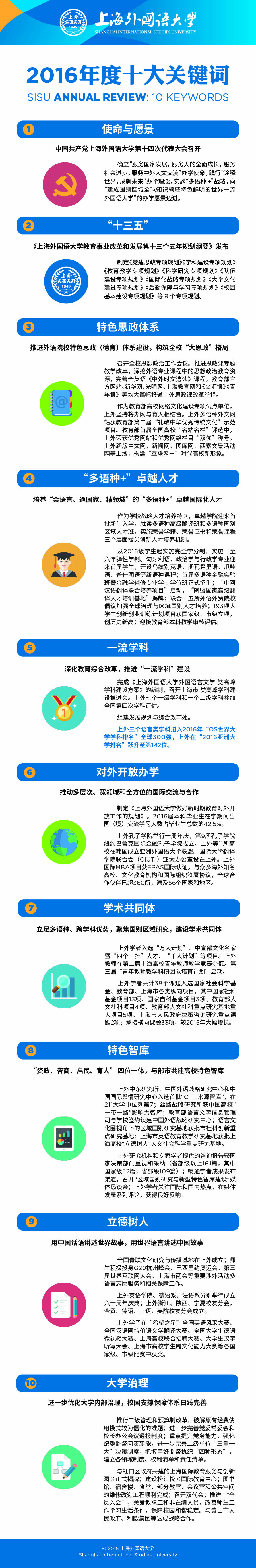 编者按:新年的钟声即将敲响,难忘的2016年即将过去,更加充满希望的2017年正向我们走来。2016是“十三五”开局之年,上海外国语大学召开了第十四次党代会,发布了“十三五”规划,稳妥推进教育综合改革。年终岁末总结之际,上外官方微信平台微校刊《西索》发布十大关键词,带你盘点我们一同走过的2016年。